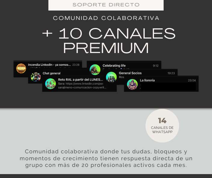 Entonces es cuando el concepto de membresía colaborativa cobra sentido. Tienes una comunidad de WhatsApp con canales específicos donde puedes consultar dudas, celebrar tus triunfos, llorar tus errores y aprender del resto. Donde cada mensaje es contestado no por uno, sino por la mayoría de sus miembros dándote enfoques diferentes para una misma situación.